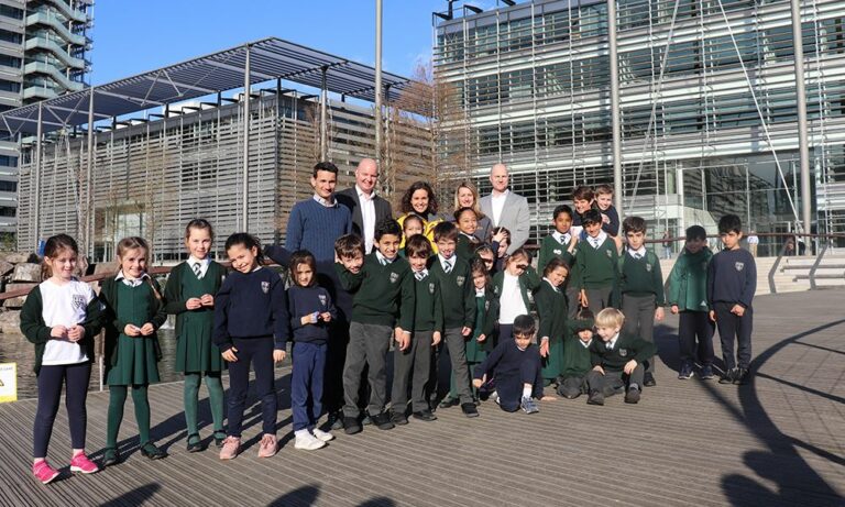 Picture caption: From left to right around the pupils of St Mary’s primary school: Andrea Carnevali, Head of the Group of parents who has been leading the creation of the Chiswick Oasis, Matt Coulson, CEO Chiswick Park Enjoy-Work, Charlotte Fougeres, PR & Community Manager Chiswick Park Enjoy-Work, Carly Gibbs, Head of Guest Experience, Glen Kitching, Operations Manager.
