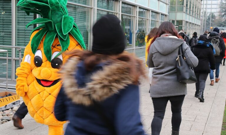 1,200 fresh fruits and 150 yellow flowers were given away between 8.00am and 9.00am today. A giant pineapple mascot was also walking around the Campus to put a smile on everyone’s faces in an effort to forget about the post-Christmas blues, cold weather and dark mornings.